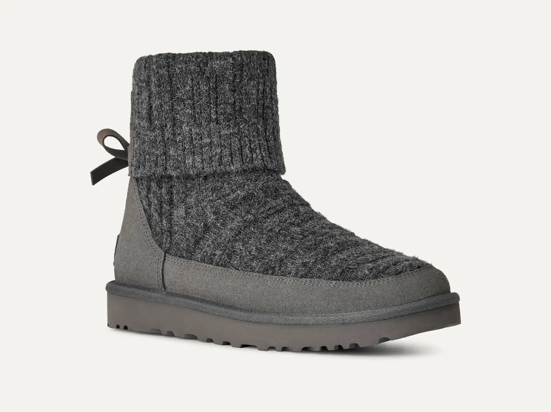 Notre Classic Mini Cabelle en maille. Idéale pour aller savourer une tasse de chocolat chaud, elle présente une tige qui rappelle le pull en maille torsadée que vous adorez. Dotée de détails en daim lisse, elle présente également des lacets en daim assortis et une fermeture à anneau en métal à l’arrière.