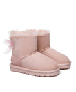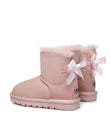 The iconic design makes these Classic Mini Bow UGG Boots a timeless addition to the wardrobe. Featuring a sweet silky bow, your little ones will love wandering around in those fluffy sheepskin boots. Premium Australian double face sheepskin combines comfort and durability, and breathes to keep those little toes warm in winter and cool in summer. The plush wool insole delivers top-of-the-line comfort, and the soft rubber flexible outsole makes these boots ideal for indoor and outdoor wear. Comes with a special water-resistant coating that resist dirt and slows the penetration of water to keep the surface dry.