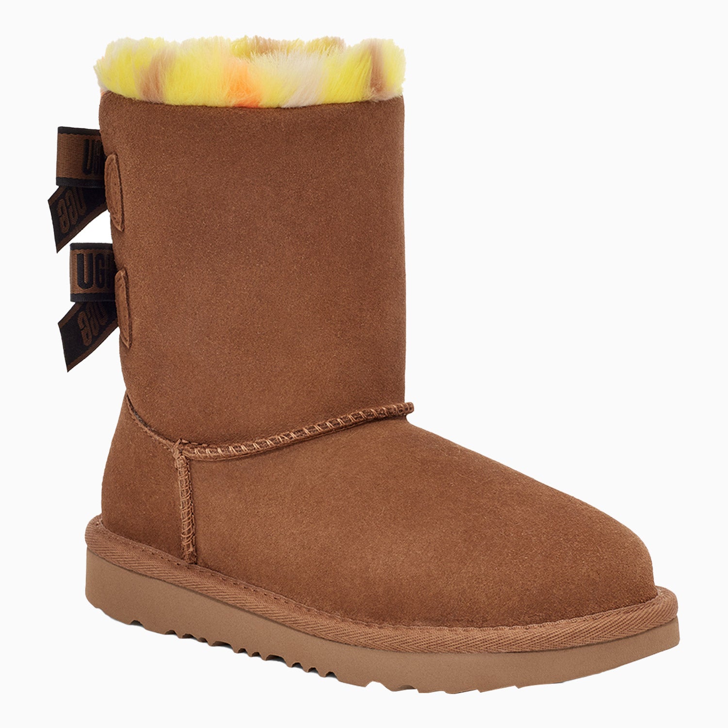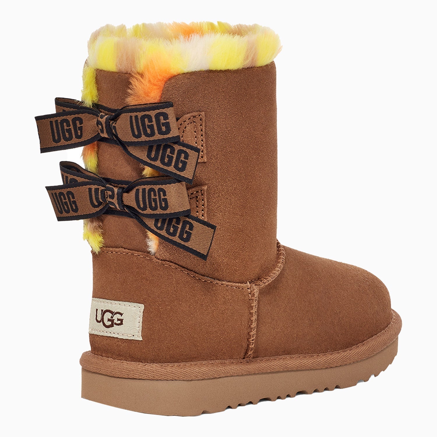 Our latest version of the Bailey Bow features exaggerated plaid fluff offering bold color and texture. Pre-treated to keep it looking better for longer, it's built for kids on the move with a super-lightweight outsole for traction and durability. Treadlite by UGG Proprietary compound which increases cushioning and traction for a supremely lightweight, ultra-durable sole. Post-Applied Treatment Treated to repel light amounts of water. The product should be re-treated periodically to maintain protection. Faux Fur Made with synthetic fibers woven together for a luxuriously fluffy feel.