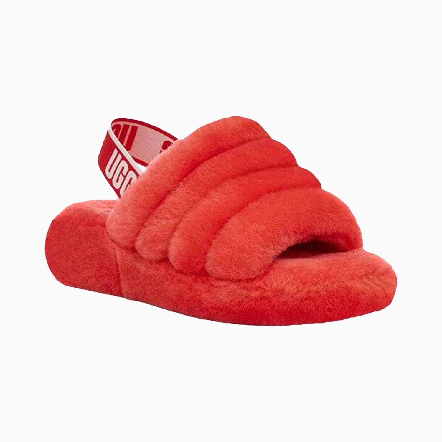 Restful days ahead with UGG Women's Fluff Yeah Slide features a 10mm sheepskin upper, elastic strap with UGG graphic, 10mm sheepskin lining, 10mm sheepskin insole, sheepskin-wrapped midsole, molded rubber outsole, 1.5" heel height, woven label with UGG logo on insole. A good easy-on choice for all.